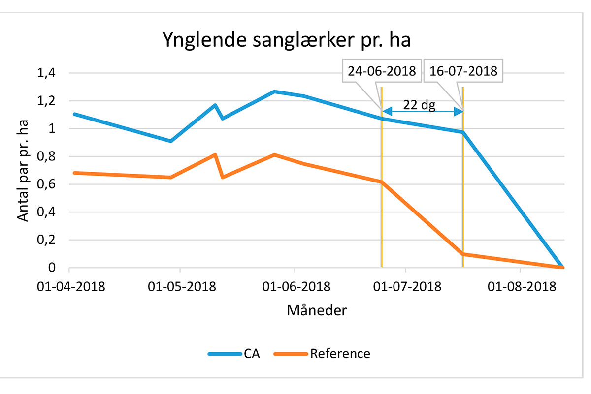 Hvad sanglærkerne angår ynglende de med større tæthed i CA- end i referencemarkerne (således 1-1,2 par/ha mod 0,6-0,8 par/ha), og de nåede tilsyneladende et kuld mere, end lærkerne på konventionelle marker (nemlig 2-3 mod 1-2).
