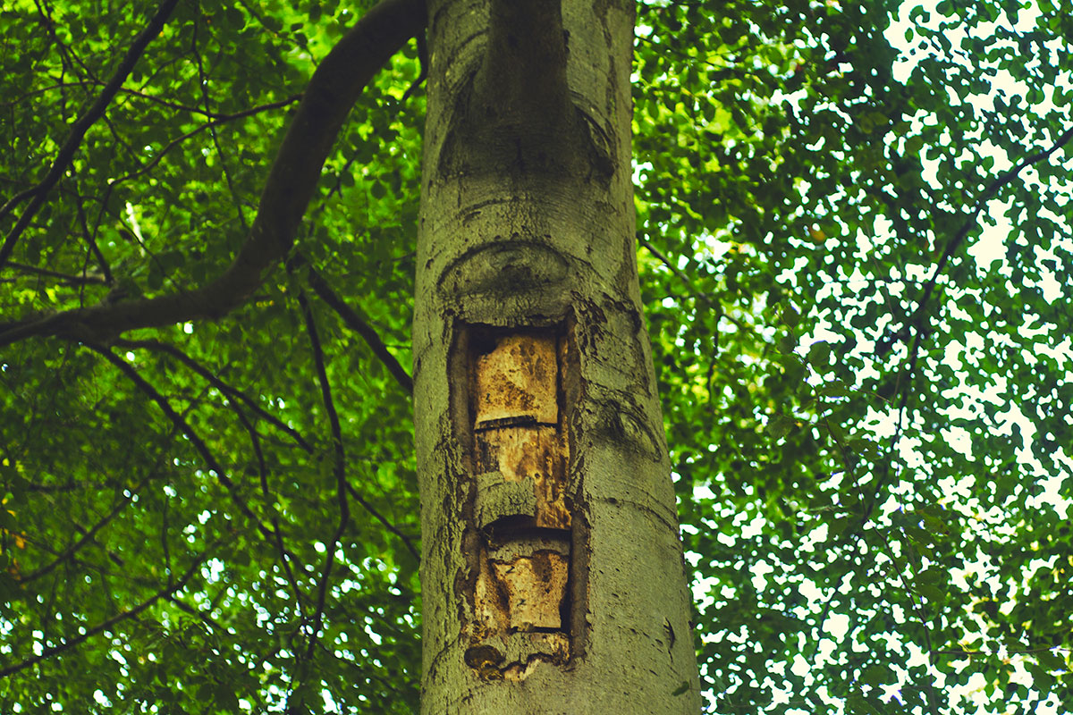 ”Vi skærer huller i træstammerne, flår barken af, trækker toppen af træer med et stort traktorspil, påfører træet brandsår, borer huller til flagermus og spætte – for bare at nævne nogle metoder,” siger han og peger op på en gammel bøg, hvor der er boret hul og skrællet bark af.