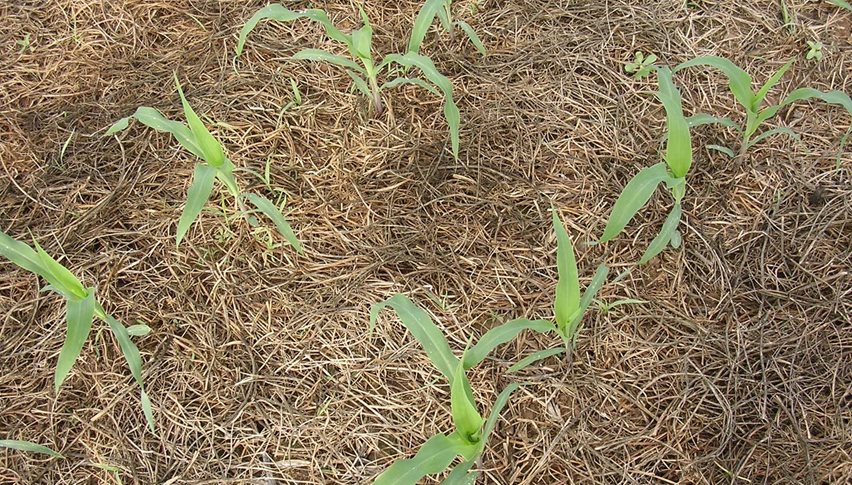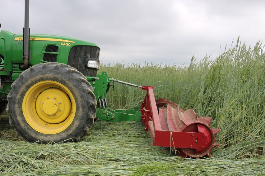 Vi brugte desuden knivtromlen, som oprindelig er udviklet på Rodale Institue, til at dække jorden med vores forfrugt. Knivtromlen er en tromle fyldt med vand og har knive monteret hele vejen rundt, knivene skærer ved tromling plantestænglerne for hver knap 20 cm. I Pennsylvania, USA, hvor den ene forskningsgård er placeret, kunne vi så overvintrende vintervikke (Vicia villosa) i efteråret og allerede i maj/juni ved fuld blomst stadiet, tromle et tæt, cirka 5 cm tykt, jorddække til vores afgrøder.