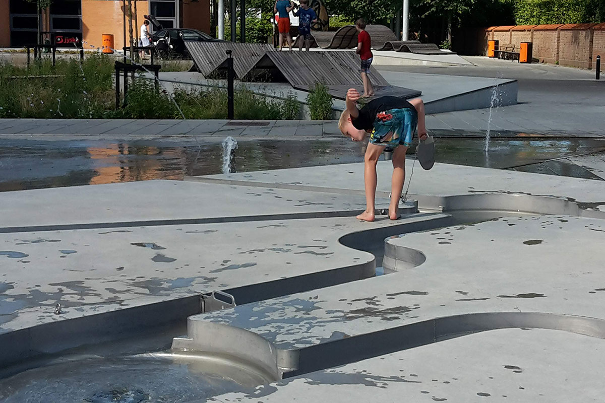 Billund Bæk har altid fungeret som flora og faunapassage og gydevej for fiskene. Nu fungerer den tilmed som opsamlingssted for regnvand på sin vej forbi byrummene omkring Lego House, og bækkens forløb er integreret i byrummenes designkoncept. Foto: Arkitema.  Arkitema