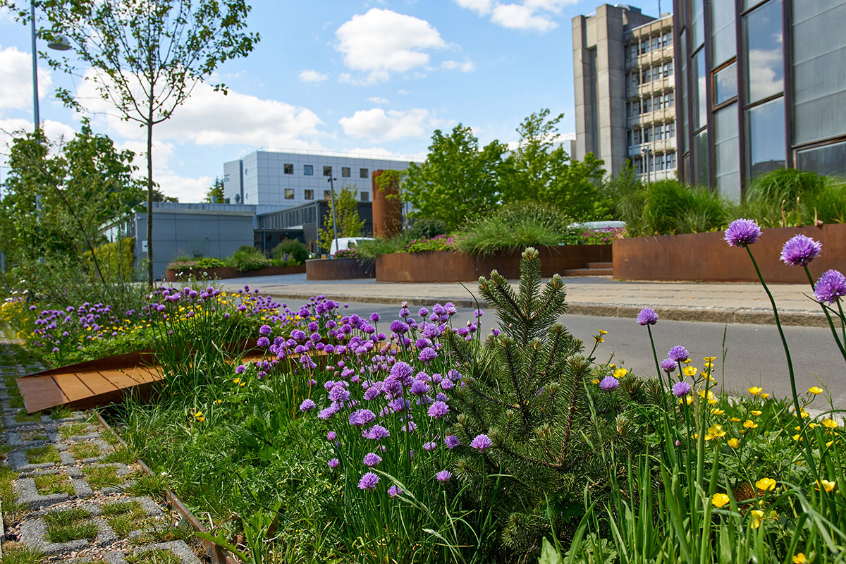 Frederiksberg Kommune er i fuld gang med at anlægge skybrudsprojekter. På den ellers befærdede Bülowsvej har man indfriet visionen om en grøn bygade, hvor regnvandet tæmmes i frodige og blomstrende vejbede, der fra starten tiltrak både insekter og fugle. Foto: Niels Lützen.  Niels Lützen