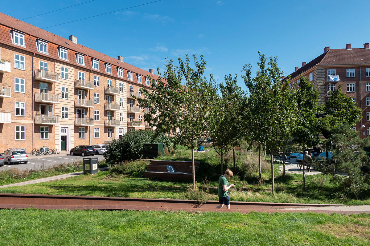 I Malmø-forstaden Augustenborg har man forsøgt at forberede sig på klimaændringerne som følge af global opvarmning. I byen har man fx lavet åbne kloakker til afledning af regnvand og græs på tagene for at holde regnvandet tilbageholde. Foto: Terkel Broe Christensen/Ritzau Scanpix. Terkel Broe Christensen/Ritzau Scanpix