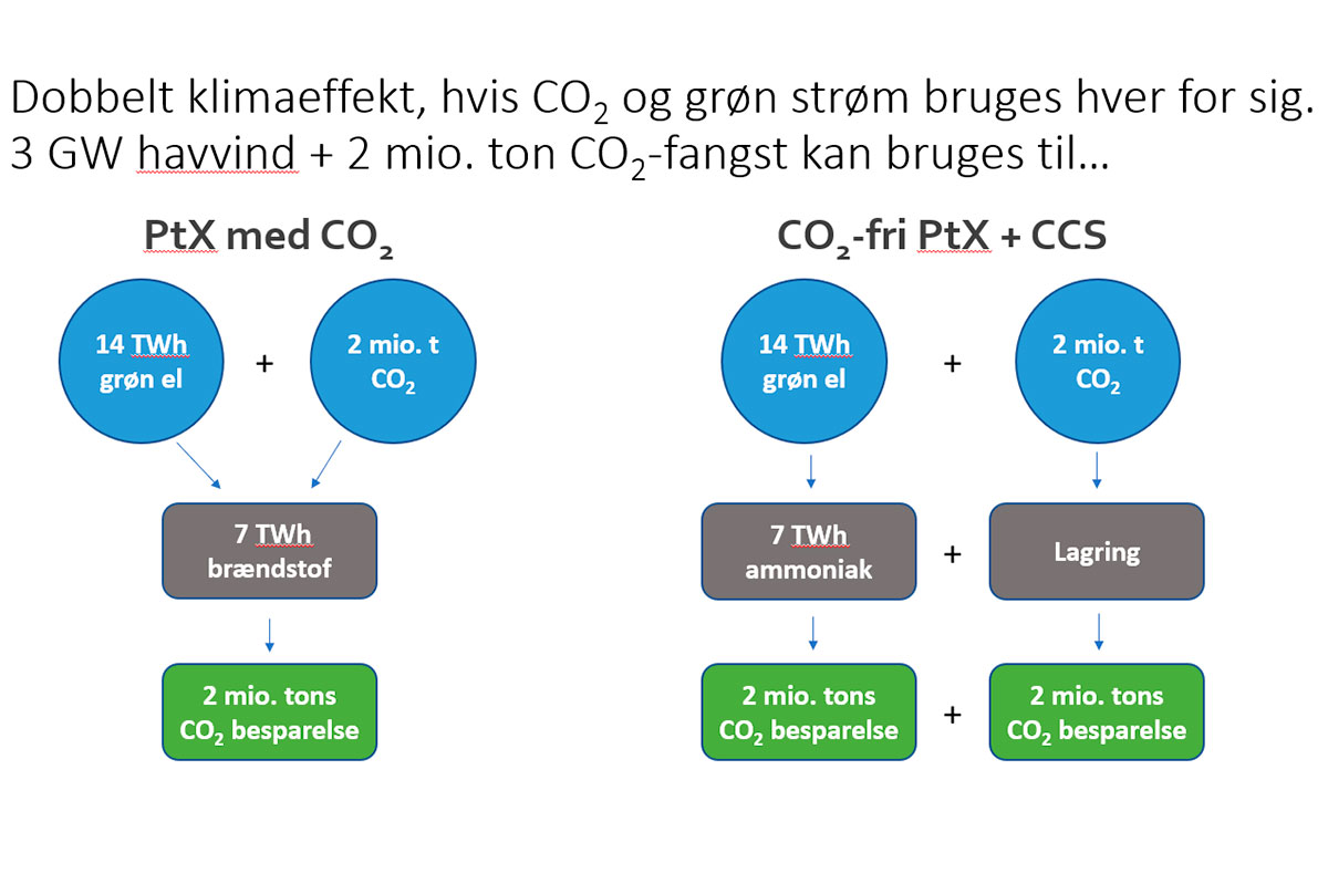 Bruger vi grøn strøm og CO₂ hver for sig til hhv. brint eller ammoniak og lagring af CO₂ i undergrunden, kan vi opnå den dobbelte effekt: Erstatning af et fossilt, CO₂-udledende brændstof med et ikke-udledende og samtidig reduktion af CO₂-koncentrationen i atmosfæren