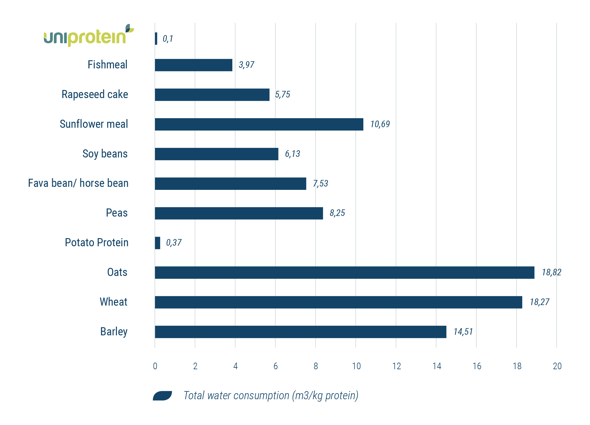 Landbruget er verdens største konsument af vand og forbruger næsten 70 pct. af alt anvendt ferskvand. Unibios teknologi reducerer brugen af vand, fordi produktionen af 1 kg Uniprotein® produkt kun kræver 10 liter vand sammenlignet med produktionen af 1 kg protein fra sojamel, som kræver cirka 6000 liter vand.