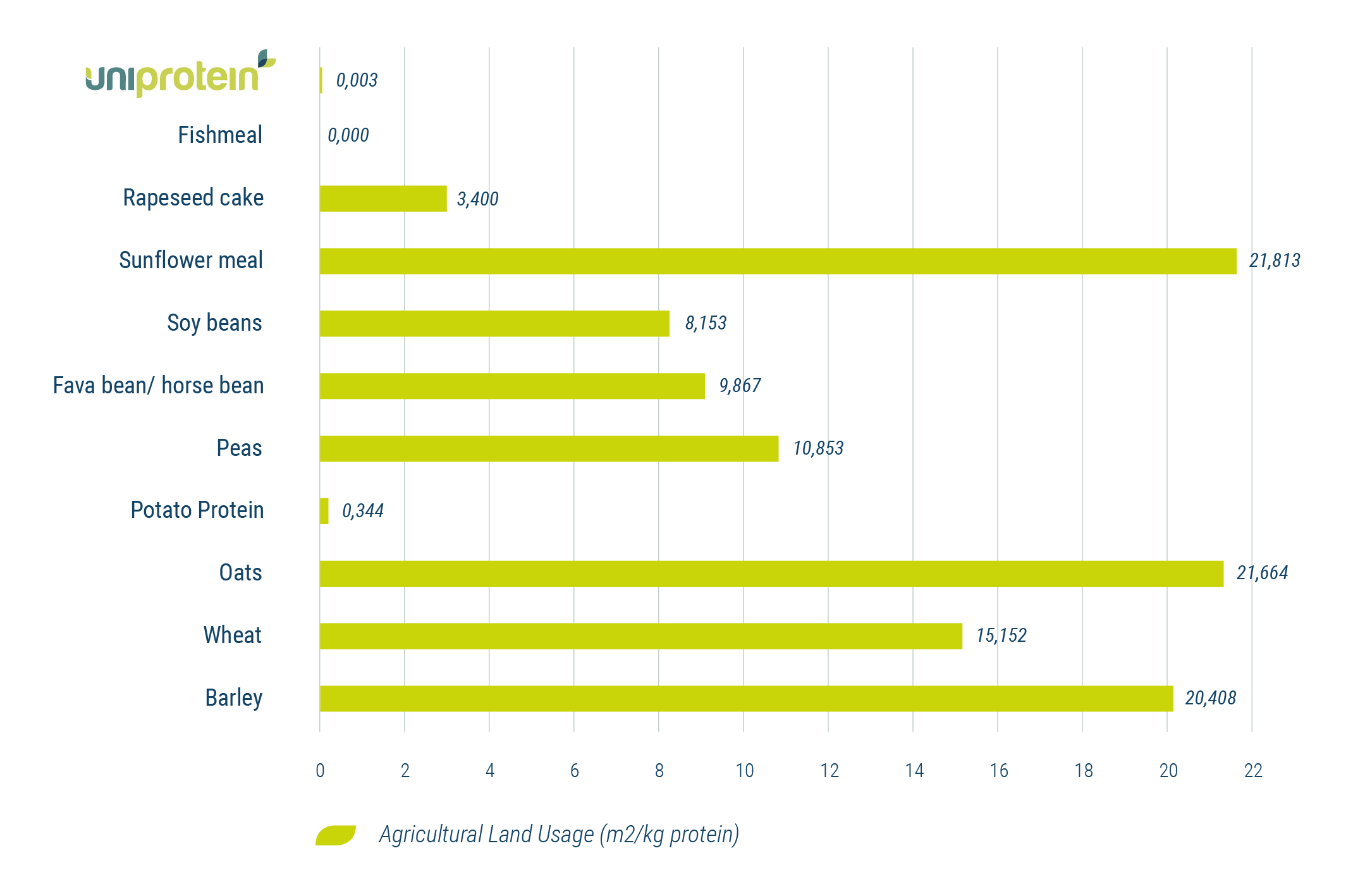 For at fremstille 1000 ton Uniprotein® om året skal der bruges ca. 3000 m2 industrijord, hvor man i sojabønneproduktion skal bruge ca. 851.300 m2 for at producere samme mængde (Christine Dasanayake).