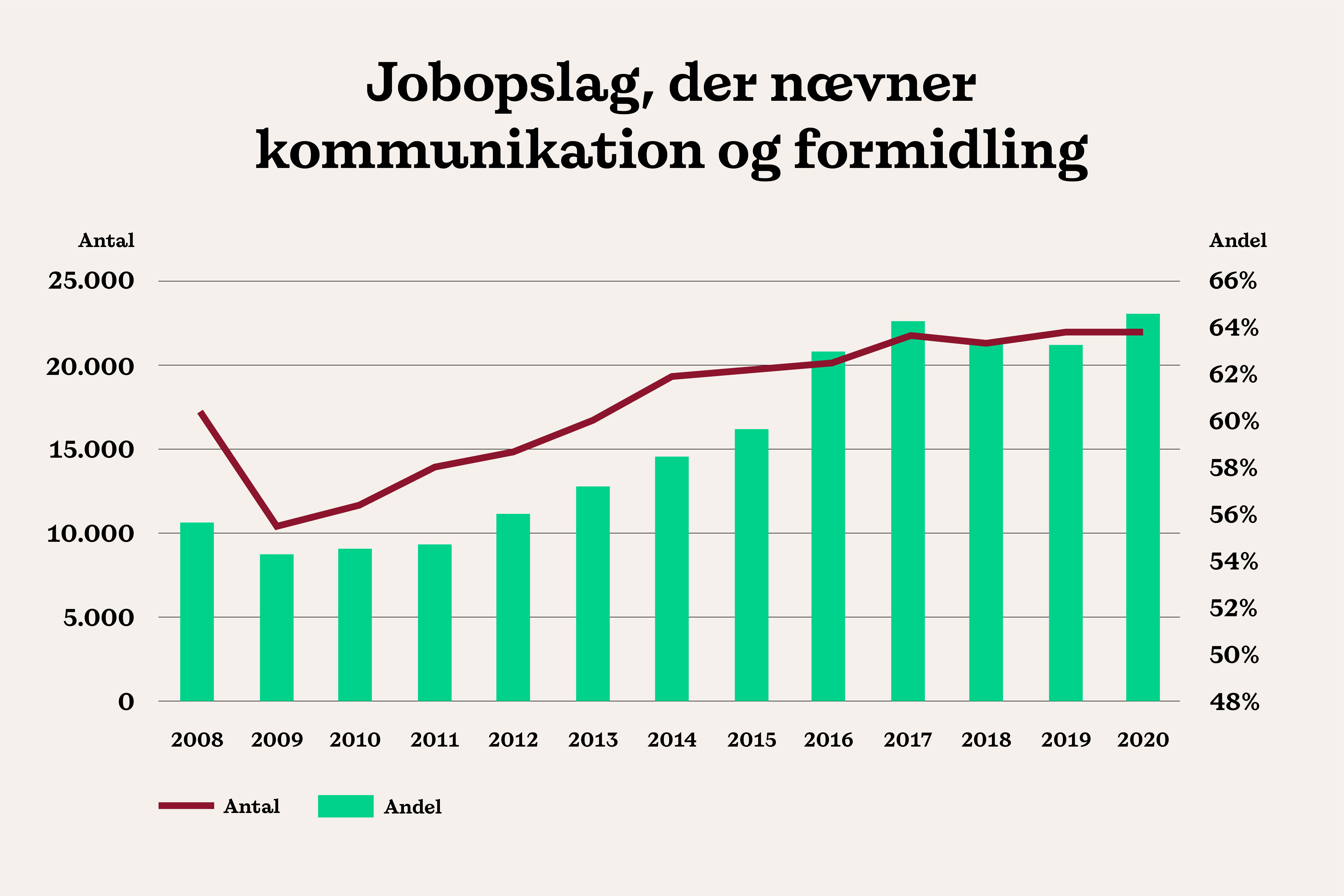 Stigningen i jobopslag der nævner kommunikation og formidling, har været støt stigende siden 2016 og det ser ikke ud til at stoppe.