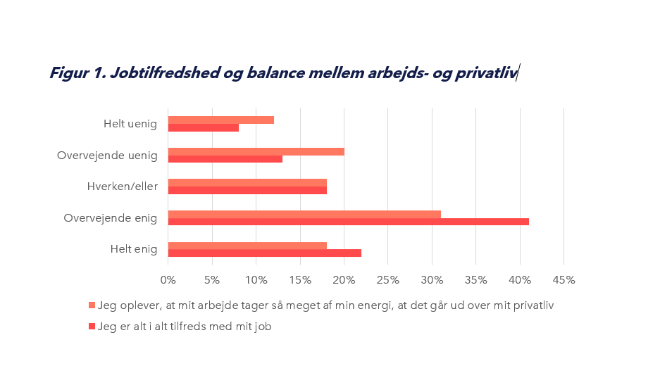 Næsten halvdelen af medlemmerne oplever, at deres arbejde tager så meget energi, at det går ud over deres privatliv. Det kan virke paradoksalt, når vi samtidig lige har set, at rigtig mange svarer, at de er tilfredse med jobbet. Men som figuren herunder viser, så kan arbejdsglæde og dårlig balance faktisk ledsage hinanden. Det er en udfordring, som vi genkender i DM’s medlemsrådgivning, blandt andet fordi vidensarbejde ofte er grænseløst. Men selvom opgaverne er meningsfulde og lige ved hånden (eller PC’en), så har man brug for at koble af og lukke helt ned for arbejdet. Det er en problemstilling, mange havner i.