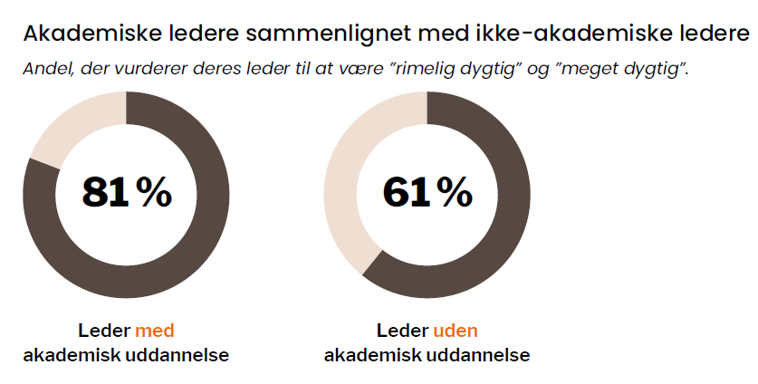 I Kandidatanalysen har 81 procent vurderet deres akademisk uddannede leder til at være dygtig, mens det gælder for 60 procent af lederne med en ikke-akademisk uddannelser. Samtidig er trivslen højere blandt de medarbejdere, der har en akademiker som chef.