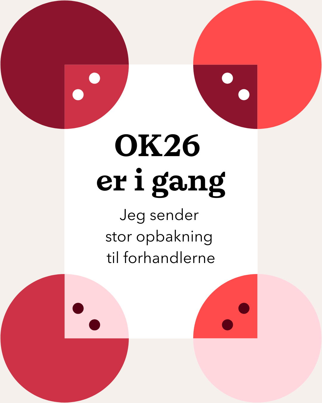Her finder du SoMe-pakker, der gør det let at dele DM’s budskaber om OK26 i dine egne kanaler. Pakkerne følger forhandlingernes faser og giver dig grafikker og tekster, du frit kan bruge, når du vil informere, engagere og få medlemmerne med i processen.